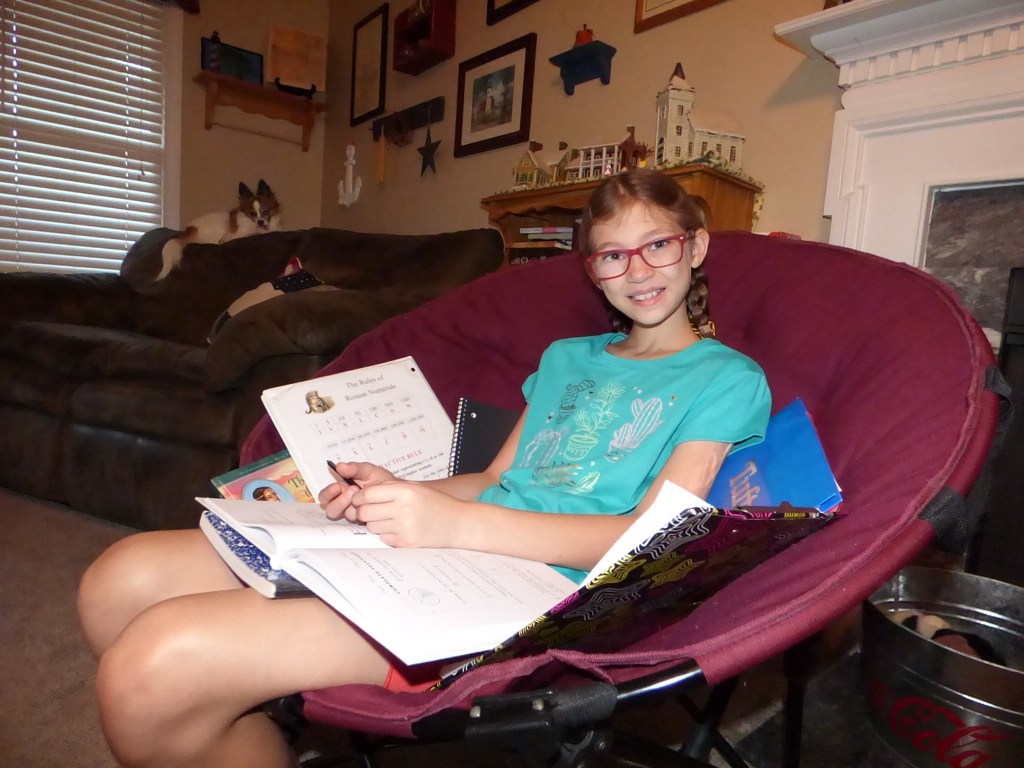 Grace is showing much maturity this year. She’s 11 and working on studies much deeper than many her age. With this year came an increase in work-load which was a lot for her to handle. I was tempted to back off a little bit in the first few weeks, but I’m glad I didn’t for her sake. I knew it wasn’t too much, but for her it was the greater amount of time. I just chose to sit with her while she worked and encourage her to stay focused. Now she is zipping away through most of it, has learned to budge her time, as well as the benefits of working ahead if she has extra time.