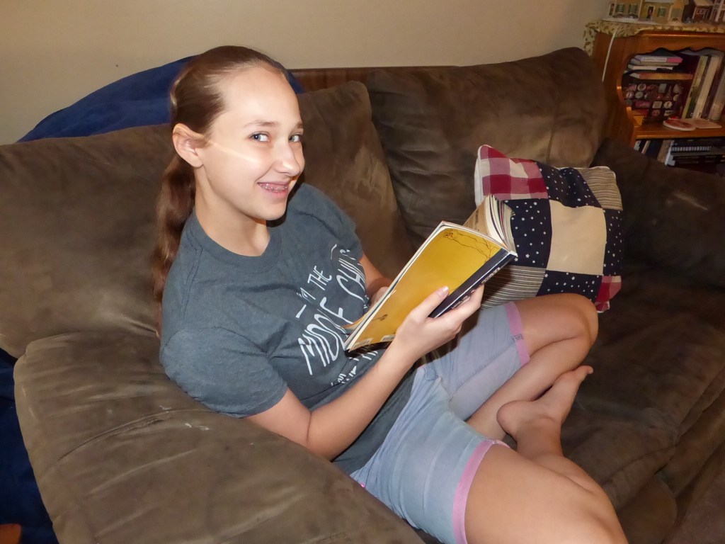 At 13 Beth has become a most studious young lady. Her favorite place to work is often in our bedroom sprawled across our bed. Many times I will enter the room to put something away to find her with work all around and listening to a musical soundtrack. These days she’s enjoying Esther from Sight and Sound Theaters or The Sound of Music.