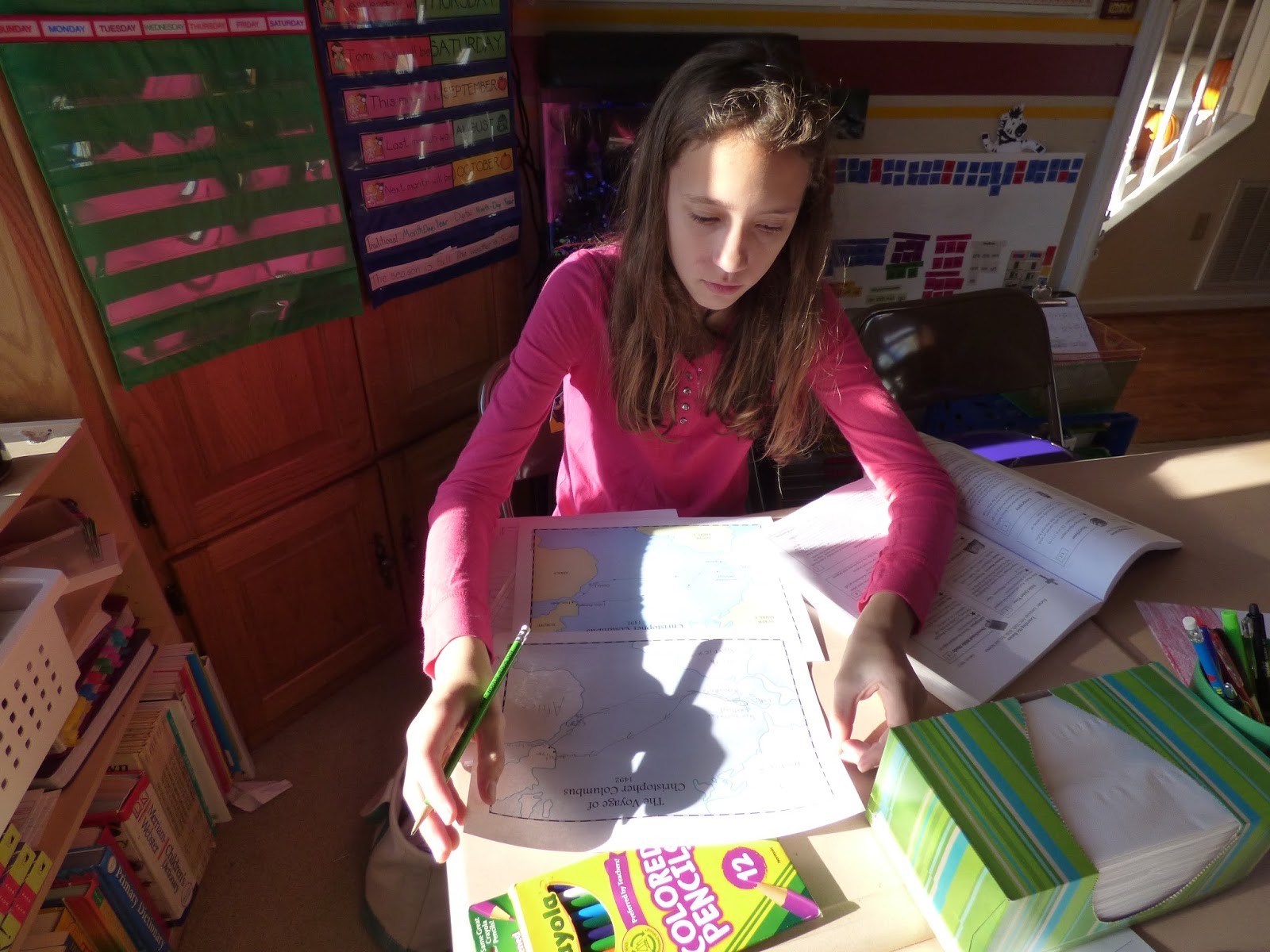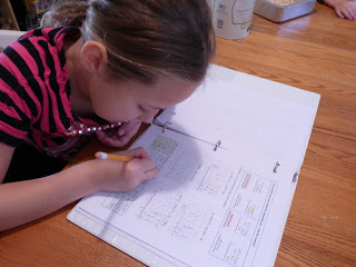 I’ve just realized almost all of my pictures of Beth are of her working on math! She really does other work, but this is one of her favorite subjects because it come easily. She does frustrate us sometimes because she hates to do extra steps which she feels are unnecessary, like writing out the operations she used for word problems. Since she rarely ever makes a mistake it is very difficult to explain the reason why she needs to do this!