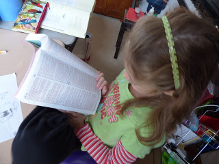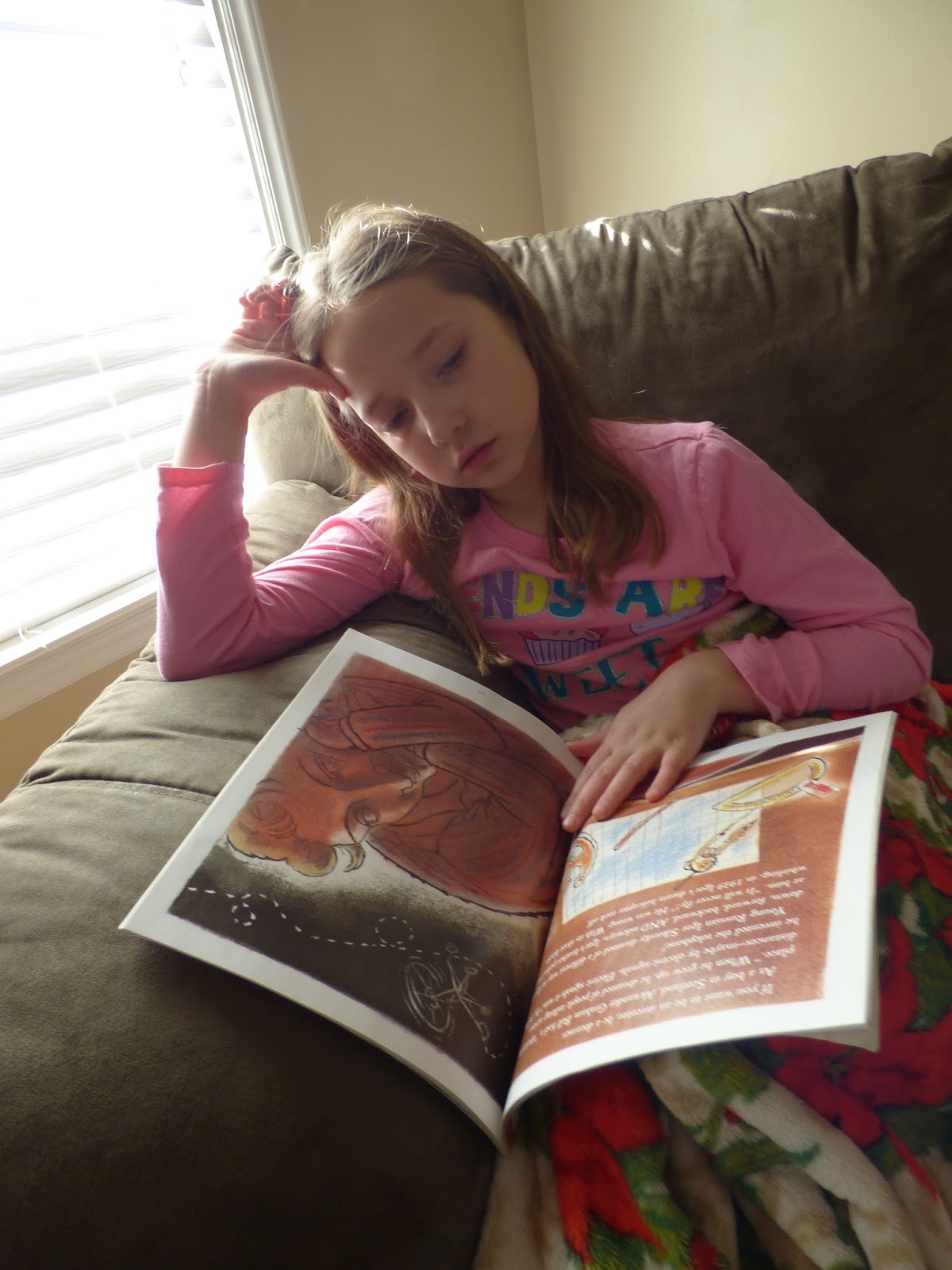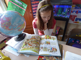 We utilize a number of other wonderful resources. This is a World History book from Usborne. We have been given so many wonderful resources between the reviews I write and the generosity of family and friends. I’ve bought a few, but only a very few beyond our regular curriculum. Many times we use these for research or further study of things that are interesting to the girls. Here, Rose is doing some research for one of her boxes using the book and our globe.