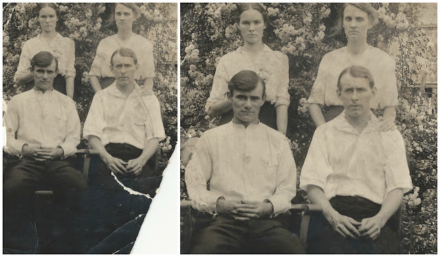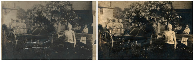 The other part of my research has been scanning and restoring photos from my husband’s great-grandmother as well as many photos from my family. I’ve taken a little break from digital scrapbooking as much to do this. Photoshop is an amazing thing! Here are some of the before and after results…
