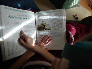 There is nothing quite as cozy as reading in Narnia! We redecorated the girls’ room for Christmas last year as winter and spring Narnia. If you look closely at the stuffed animals on the bed you will see one that is a bit more alive than the others! One of the wonderful things about homeschooling is the freedom to study wherever is the most comfortable or least distracting. Rose and Beth like to study in their room and when the weather is nice outside because I’m still working so extensively with Grace. The quieter locations are preferred for them.