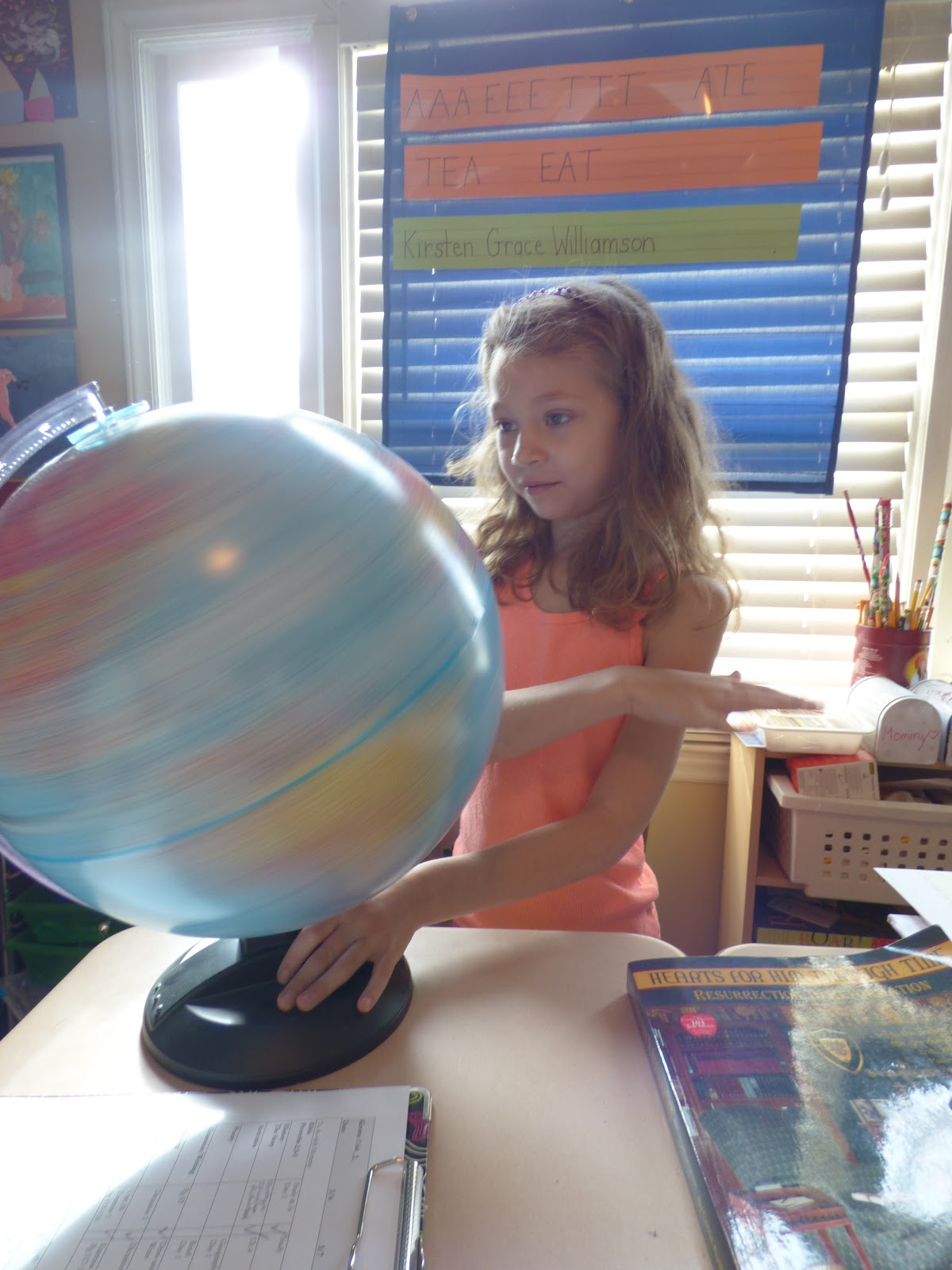 Our curriculum does an amazing job of teaching geography! We reviewed the continents and oceans this week. I still have trouble remembering to include that 5th ocean sometimes because we only had four when I was a kid! She of course loves to spin the globe as fast as she can every time we get it down!