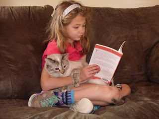 Grace loves reading with Lucy. We have a very, very tolerant cat. She gets dragged around the house and seems to actually enjoy it! Grace is reading another book we are reviewing here. You’ll get to read all about it this coming week!