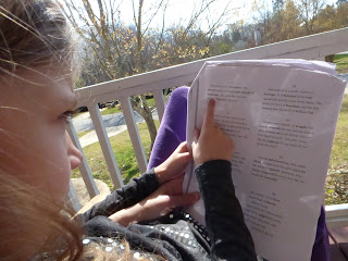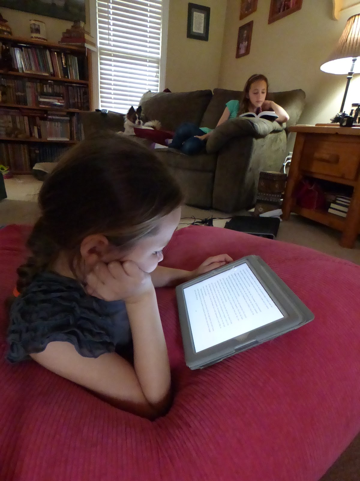 Grace: Sitting in my lap reading dictation to her sister on the front porch.