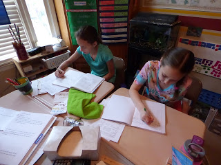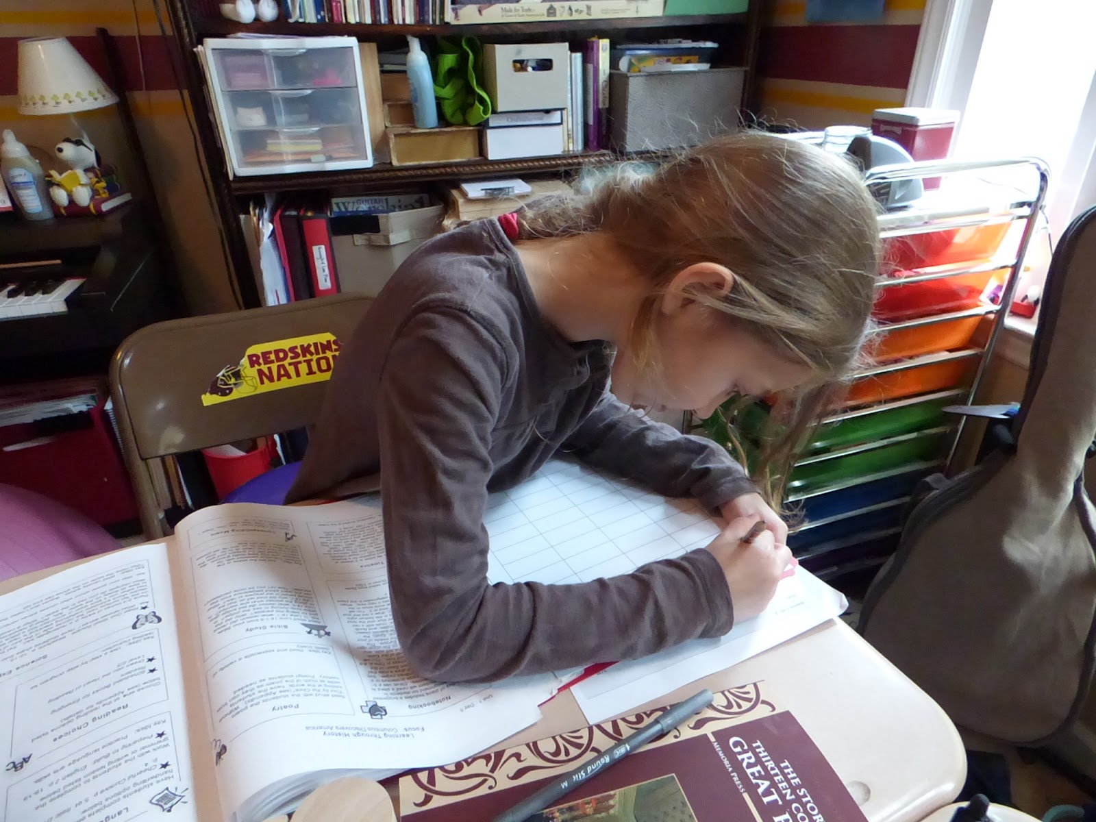 Rose and Beth are working on dictation here. Grace is too, she’s just out of the shot! I find doing the same subject at the same time can be a great time saver for all of us! Especially now that all three are completing dictation. I recite the sentences and when they are ready for the next part they put their pencil down. It is also an exercise in self-discipline because I require them to stay silent so as not to distract their sisters.