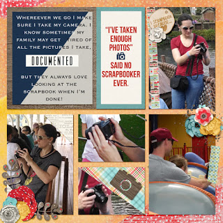 This first one is one of my favorite ever layouts! I’m rarely the subject of my scrapbook pages, but my husband and dad thought my photo taking was funny, so they took lots of pictures of me taking pictures! Ha!