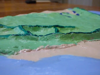 As amazing as all of these were I decided to deviate from the suggestions and we did our own creation to go along with our study of the United States this summer. As we learn the regions of America and the states which are in them, I thought it would be a great idea to give them a chance to make a topographical map. I felt very confident in doing this because have used Rigid Wrap before to make Egyptian Mummy Masks. Having worked with the material before I knew exactly what to expect.