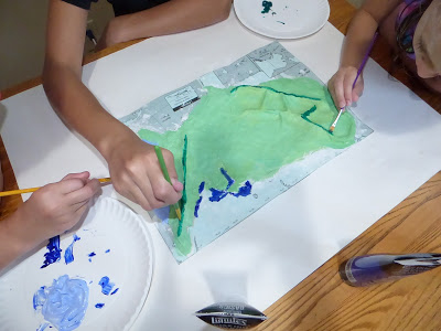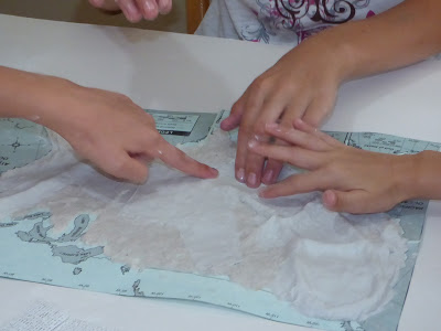 After drying the girls began to apply the rigid wrap to the map. I showed them how to manipulate it to conform to the contours of the map. That is a really fancy way to say they smushed it around to make it look right! You want to make sure to smooth the wet wrap until you do not see any holes left. This does take some time and patience. With younger children you may want to go after them and fix any spots where you still see lots of holes or they may become frustrated while painting.