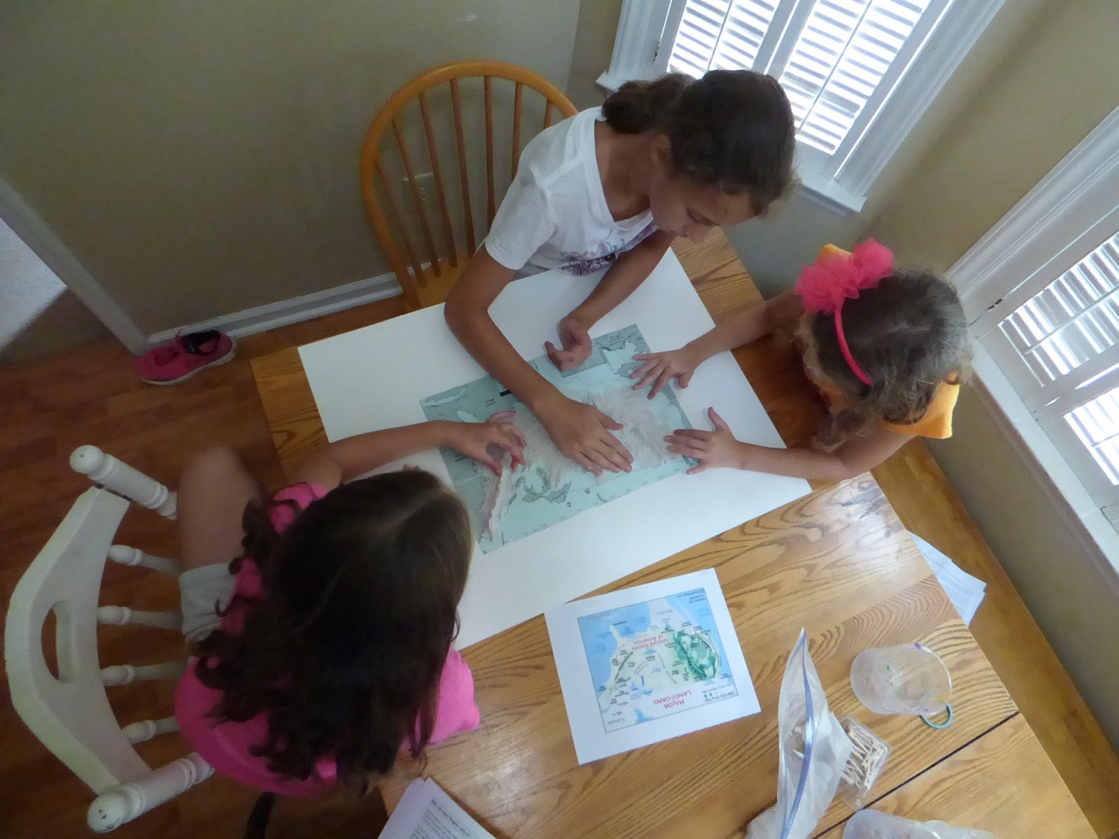 It was finally time to paint! The entire USA was pained light green and again allowed to dry for about an hour. Then the girls came back and added the details for the Great Lakes (dark blue), oceans (light blue), bordering land (tan), and the highest elevations (dark green). I showed them where to paint since we were only mapping the contiguous 48 states and needed to cover things not important to our learning process on the map, but they pretty much just went at this on their own start to finish.