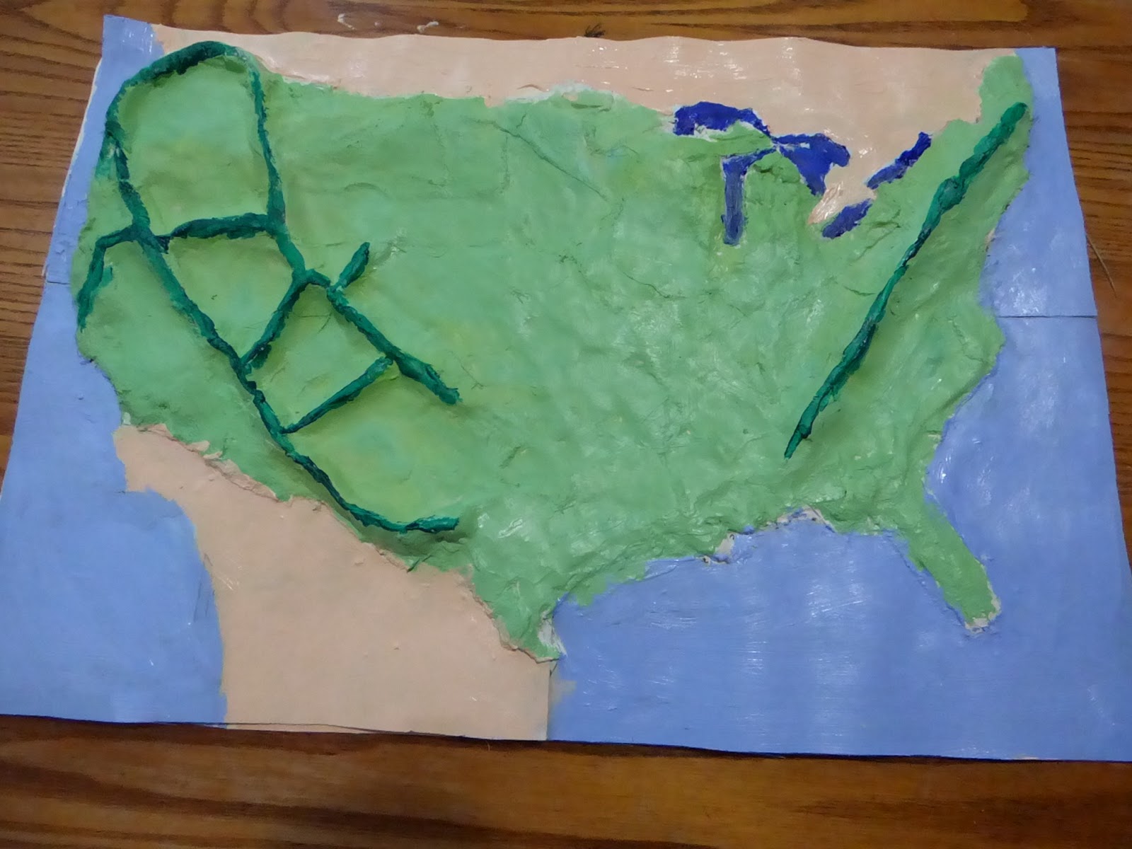 I printed a large, but mostly blank map of the USA on cardstock and attached it to poster board. I remember just how “wet” this material is in progress and I wanted to make sure their map didn’t get warped. I gave them a color coded topigraphical map of the USA and showed them how to use the CelluClay to make mountain ranges and raised topography on the map. Then I let them loose!