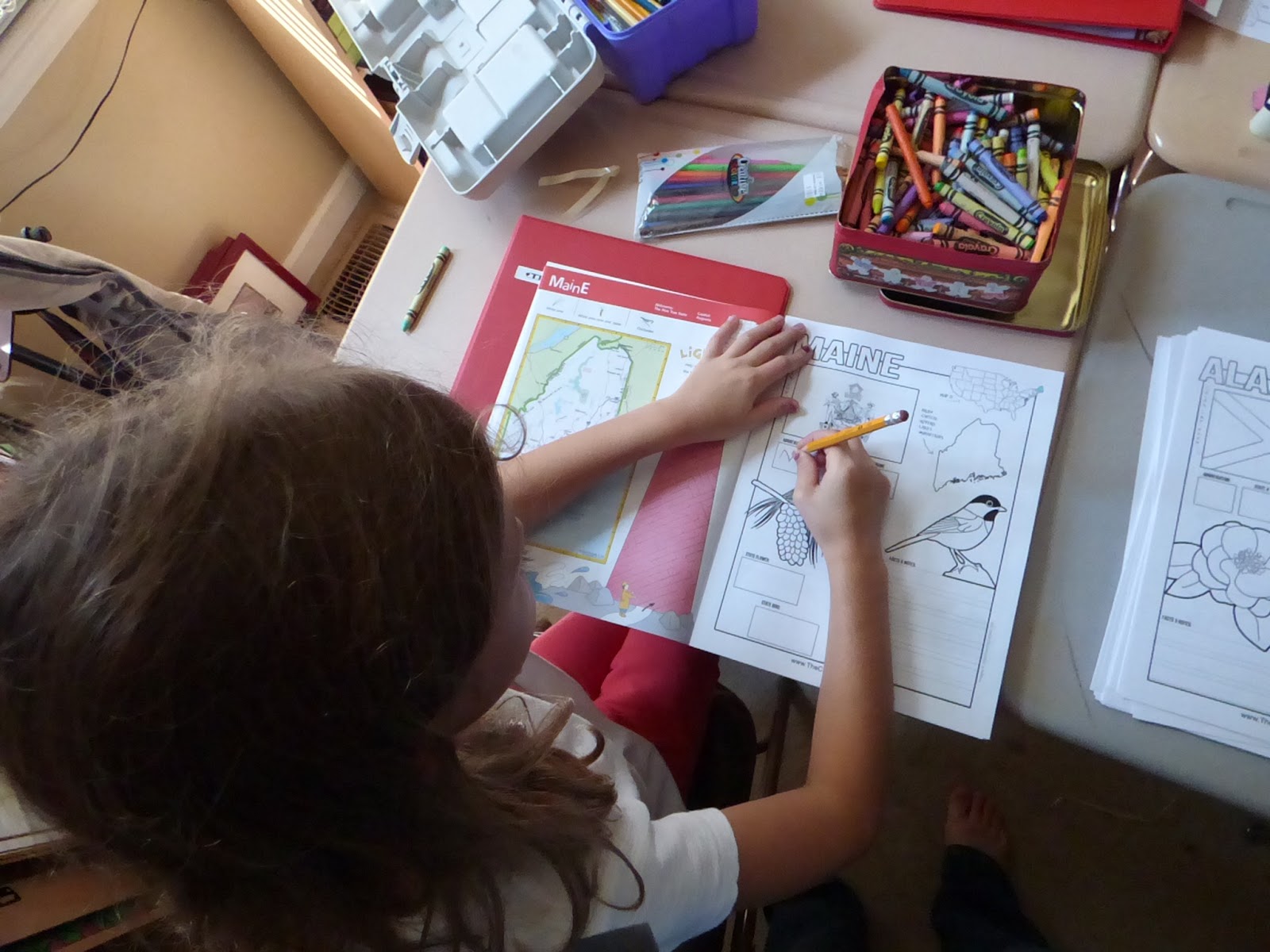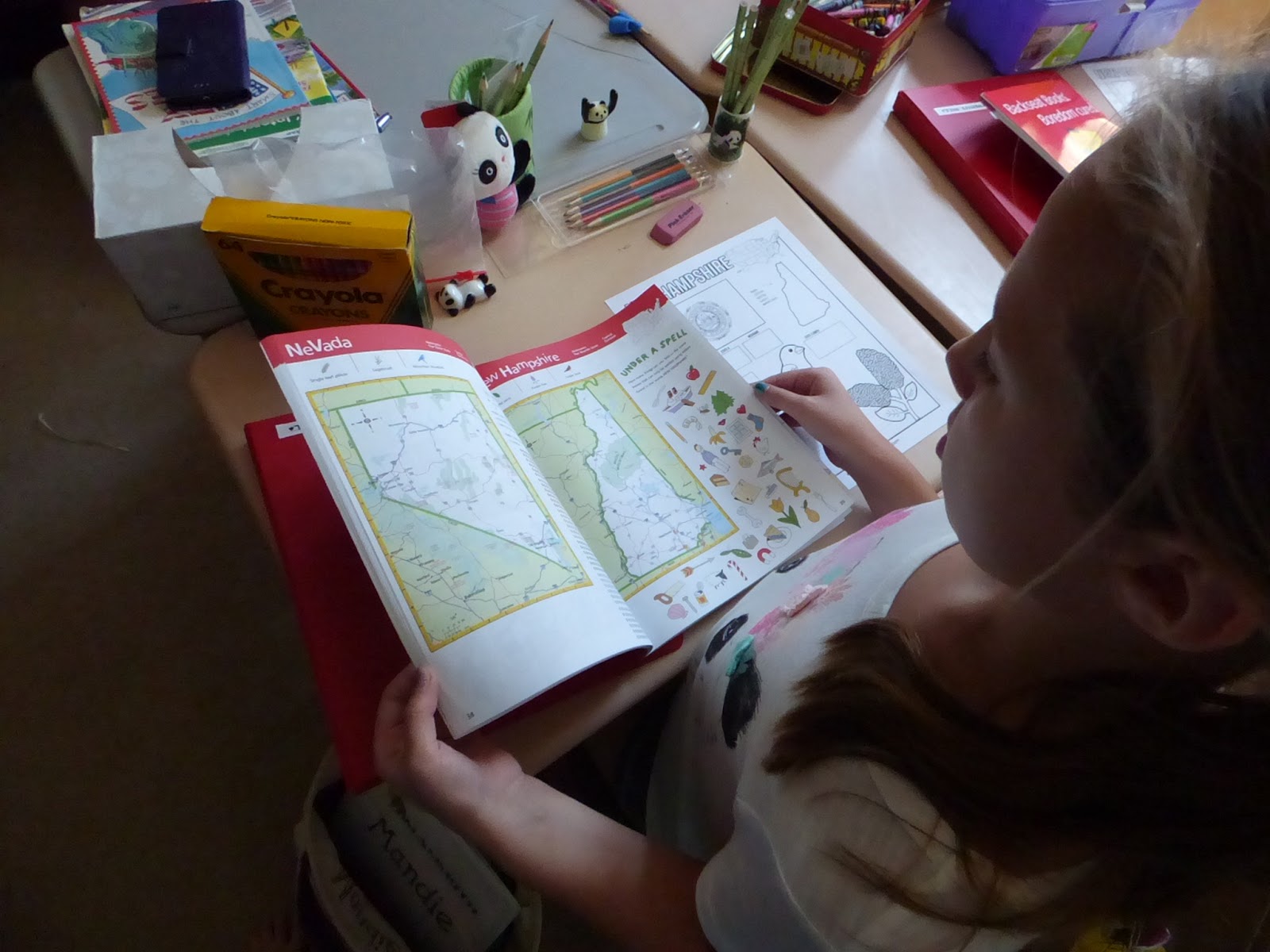 There is no set order for completion, so I decided to order the states by region, beginning with New England. I printed an entire set of states for each of the girls and organizing them by region was very easy as they are alphabetized. Each of the girls has an expensive United States road Atlas for kids I’d had tucked away for a while now. It was great for them to each have their own resource for this so they could find information for themselves. I had several other United States fact books as well.