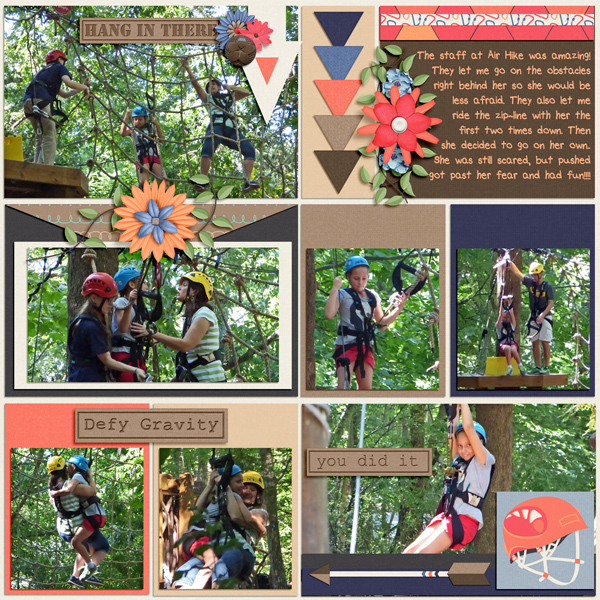 The two digital scrapbooking layouts I finished this week were actually a very recent event! We went to the zoo a week ago and while we were there had fun on the Air Hike course. This was the girls and my husband’s second time up, buy my first time. When they worked through it before I stayed on the ground to take pictures…and maybe because I have a little problem with heights, or at least a fear of falling from them!
