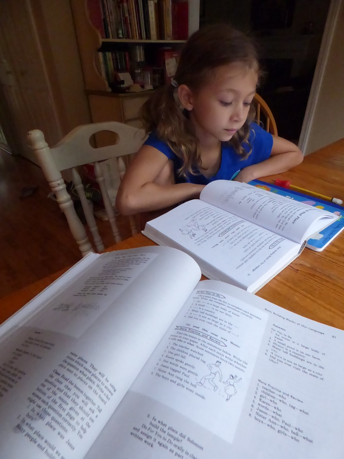 I know every week I say how easy Grace is to teach. She just really is! She loves to learn. Her latest “favorite” (according to her) is grammar! We are just using the standard Rod and Staff. I’ve used it with all three girls and it is incredibly solid. There aren’t frills, but that has never been a problem. We usually complete 2/3 of the lesson orally as suggested by Heart of Dakota. This is the key to its success I think. Too much writing and you just kill the lesson. They only have a small portion to actually write. For my older girls this is usually 5-10 sentences diagrammed. Now, current trends say that diagramming has zero value. I completely disagree! Current trends also say learning math facts shouldn’t be about memorization and I disagree there as well. And so we have an example of why homeschooling is beautiful for us. We don’t have to follow the trends!