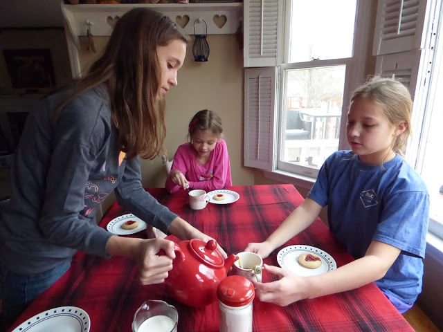 This week she baked English tea cakes and French tea cakes on different days as she studies the two revolutions. With the exception of a little instruction on how to scoop the flour for measuring and what settings were best to use on the mixer, she did everything on her own! My mom has spent time teaching the girls about baking and cooking and they help me quite a bit for meal preparation. I was pleased to see she has absorbed so much in understanding how to bake and cook. The treats were delicious, by the way!