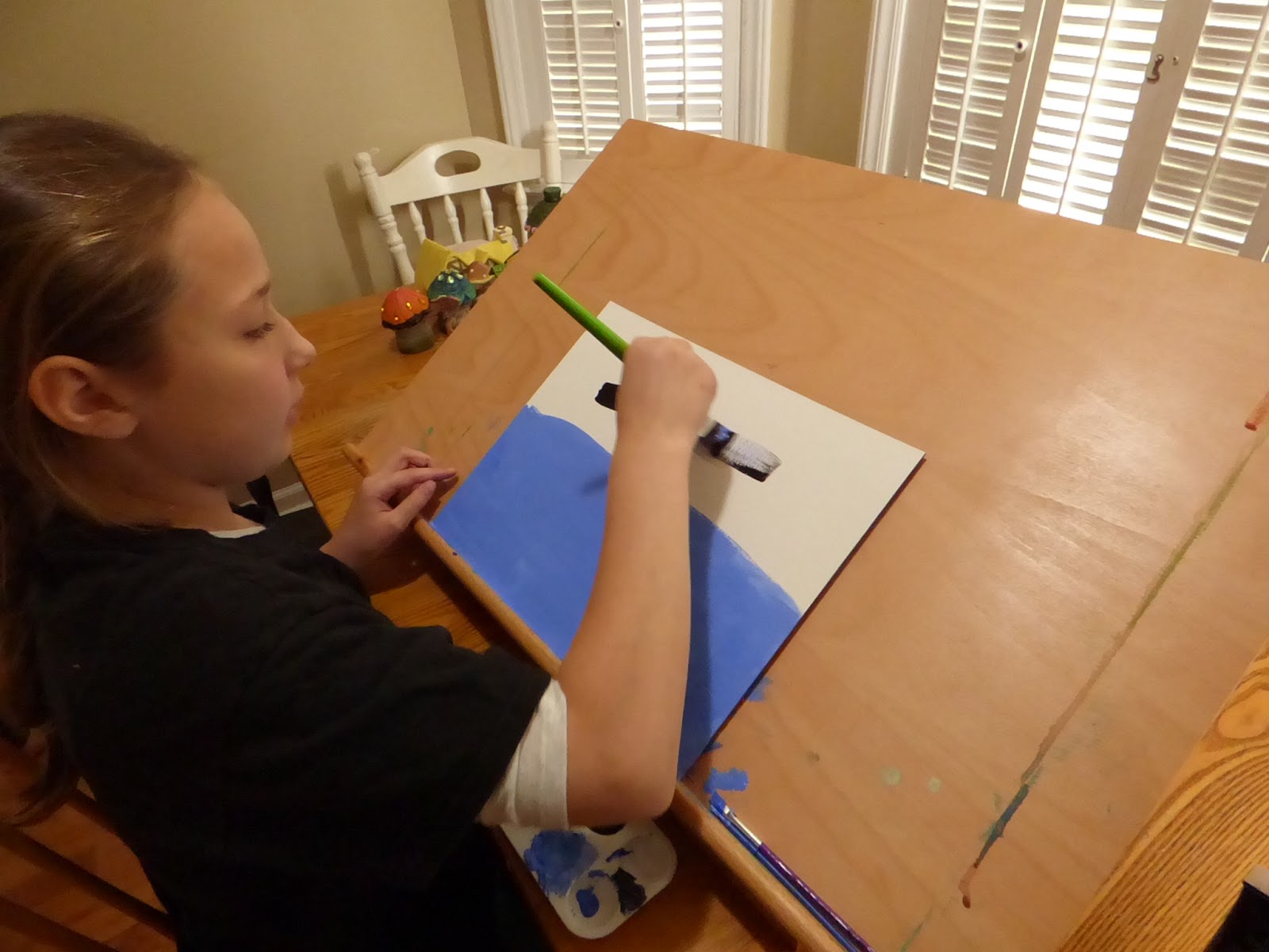 Beth worked on an acrylic painting as a part of her history project this week. I just realized I think she forgot to finish it! I will have her finish it up tomorrow and post it on Instagram so you can see the finished work. Her water background was gorgeous.