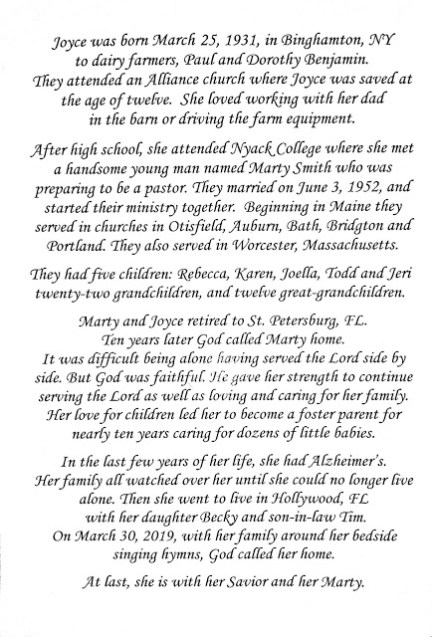 This link will take you to a collection of videos from the Celebration of Life service recorded and edited by Joyce’s granddaughter. Thank you, Laurel, for your wonderful videography and editing!