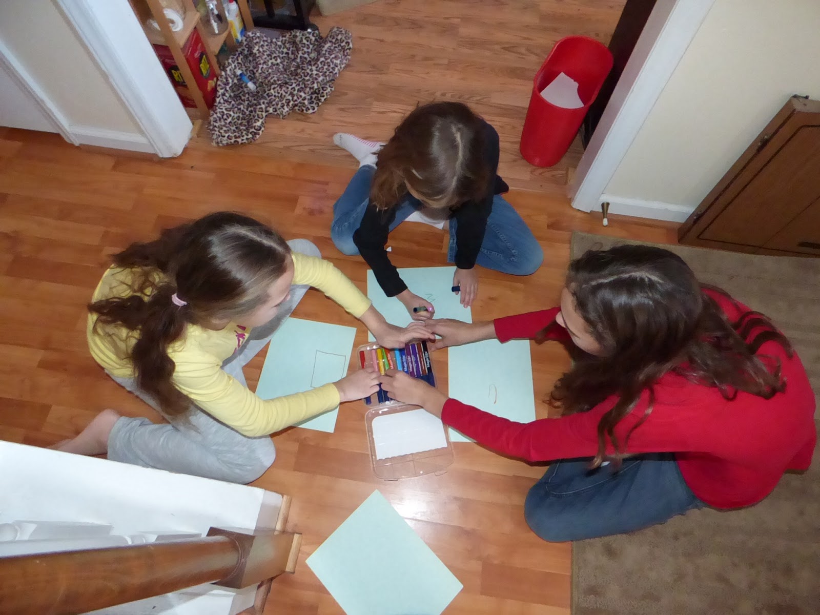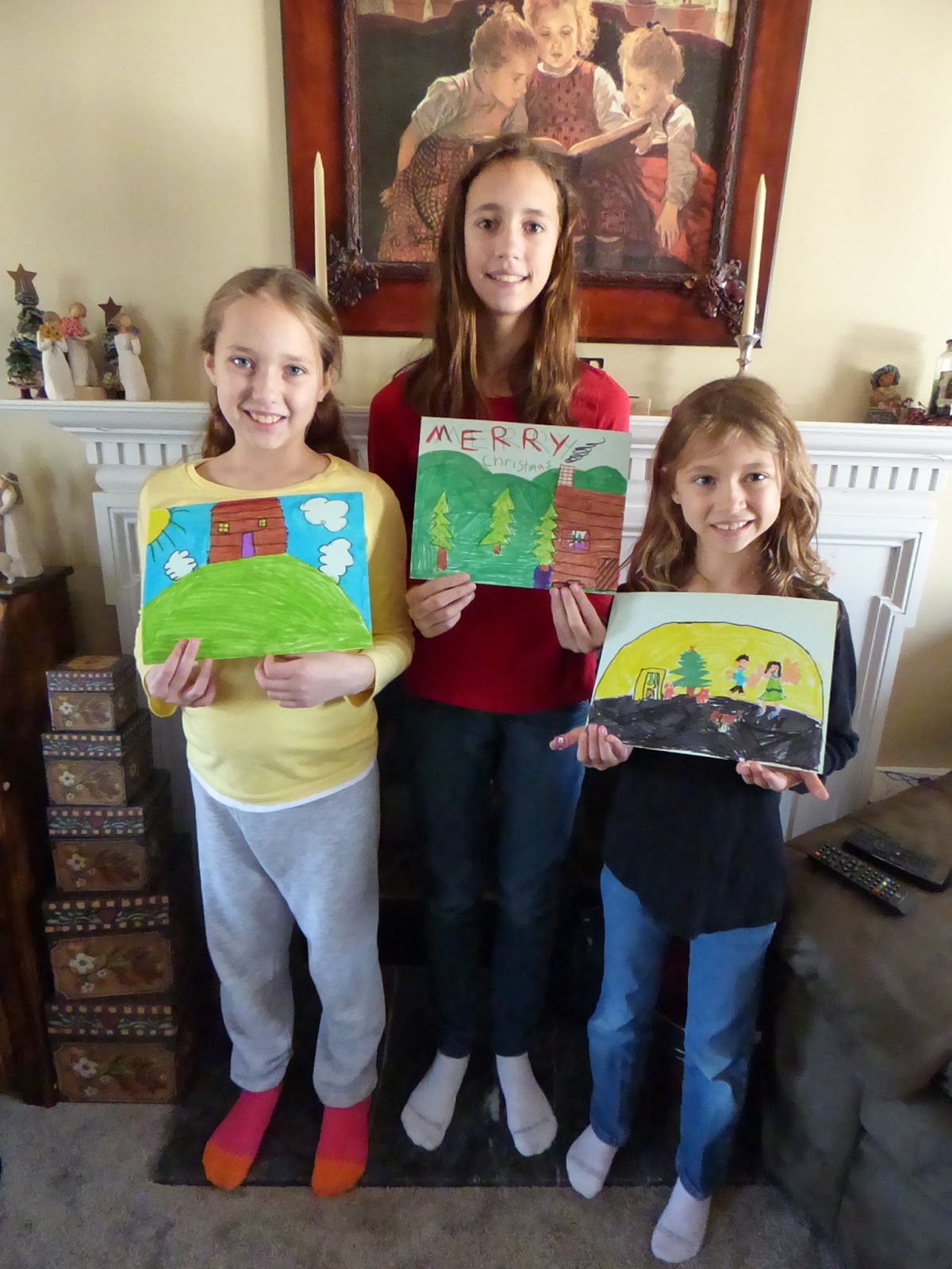 I LOVE their drawings! Rose and Grace chose a Christmas picture and Beth drew a cabin on a hill. So beautiful and see how bold these color are? This is on a slightly green tinted background paper and except for the areas not colored on you wouldn’t know it! Beth’s paper is the same as the other girls.