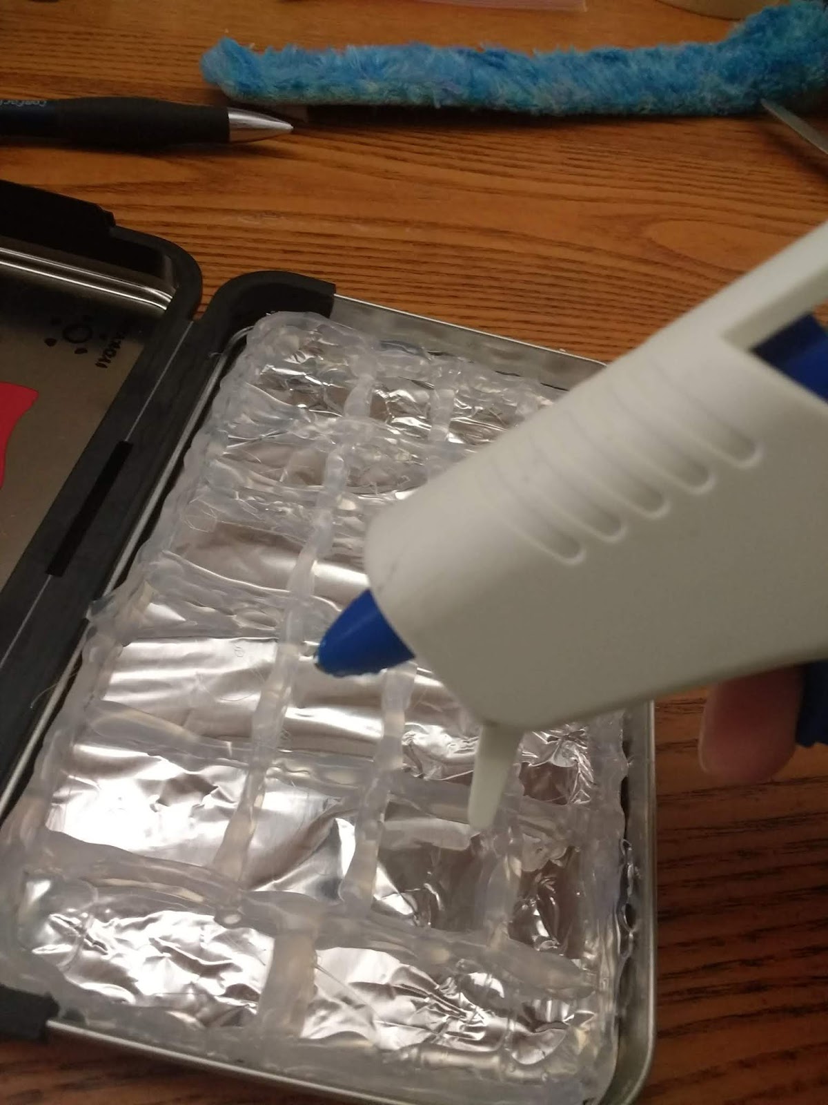 So based on the idea from the blog post I found on pinterest I used hotglue to create a divided palette. I lined the bottom with tin foil because I wasn’t sure how well the glue would stick to the container. I made 3 layers total of my grid and had this sweet little palette when I finished.
