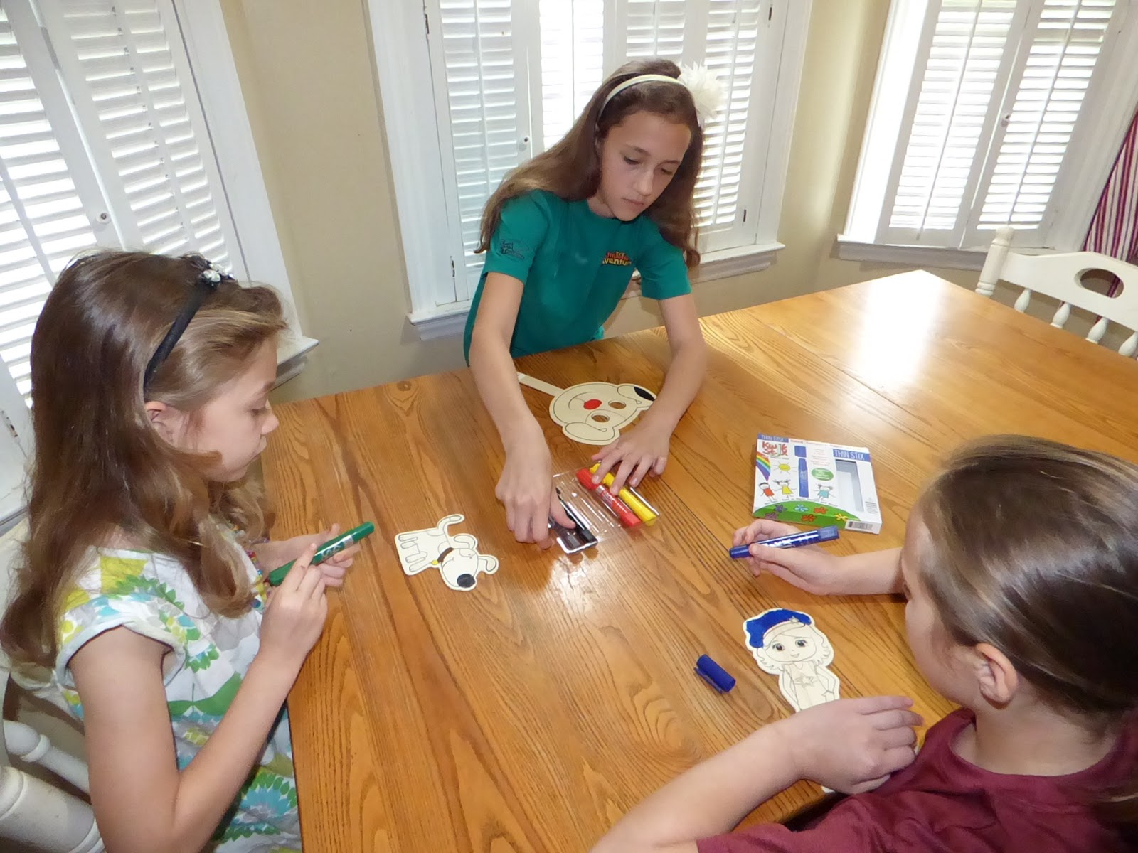 The girls had fun painting these little wooden characters from the craft store. The paint glided on easily and dried extremely fast. These dried in less than 90 seconds. Their only issue with these was that they are very thick and fine detail was a little tricky. This is only an issue because of the age of my girls. Grace did not mind not having a finer point for details, but Beth and Rose prefer a finer tip for art. These would be ideal for young crafters if you are a mom like me who is not a fan of big messes when making things. I saw no need to have the girls wear any protective clothing because the paint is in solid rather than liquid form. If the girls were younger I probably still would have had them cover with something.