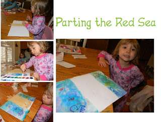Finally is Grace’s art! I think she had my favorite project of the week. First I helped her tape the center portion of a piece of photo paper. Then I drew fish using sharpie markers. She asked for an octopus even though I’m not certain there are any in the Red Sea! There is also a yellow shark with teeth, but it’s hard to see. Finally she used blue and purple water colors on the page for the water. We removed the tape so the Israelites could walk on dry land. After it dries I’m going to let her use some Little People to act it out!