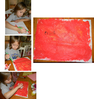 Rose is the real art love of the my three girls and just enjoys any way she can be creative. She very much enjoyed making sand art this week. We first colored the sand (actually salt) with colored chalk instead of food coloring as recommended (Thanks Pinterest!). Rose then made her design on a paper plate, then traced it with watered down glue. She did a section with glue, we put the colored salt on, shook off the extra, then she did another section with a different color. Such beautiful creativity!