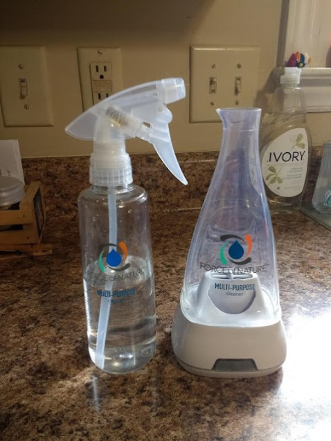 Force of Nature uses salt, water, and vinegar, already mixed in handy dandy little capsules. You simply add one capsule to the bottle and push the button on the machine. That’s where the magic happens. The water is electrolyzed by the machine and the combo of safe household ingredients creates a powerful cleaner.