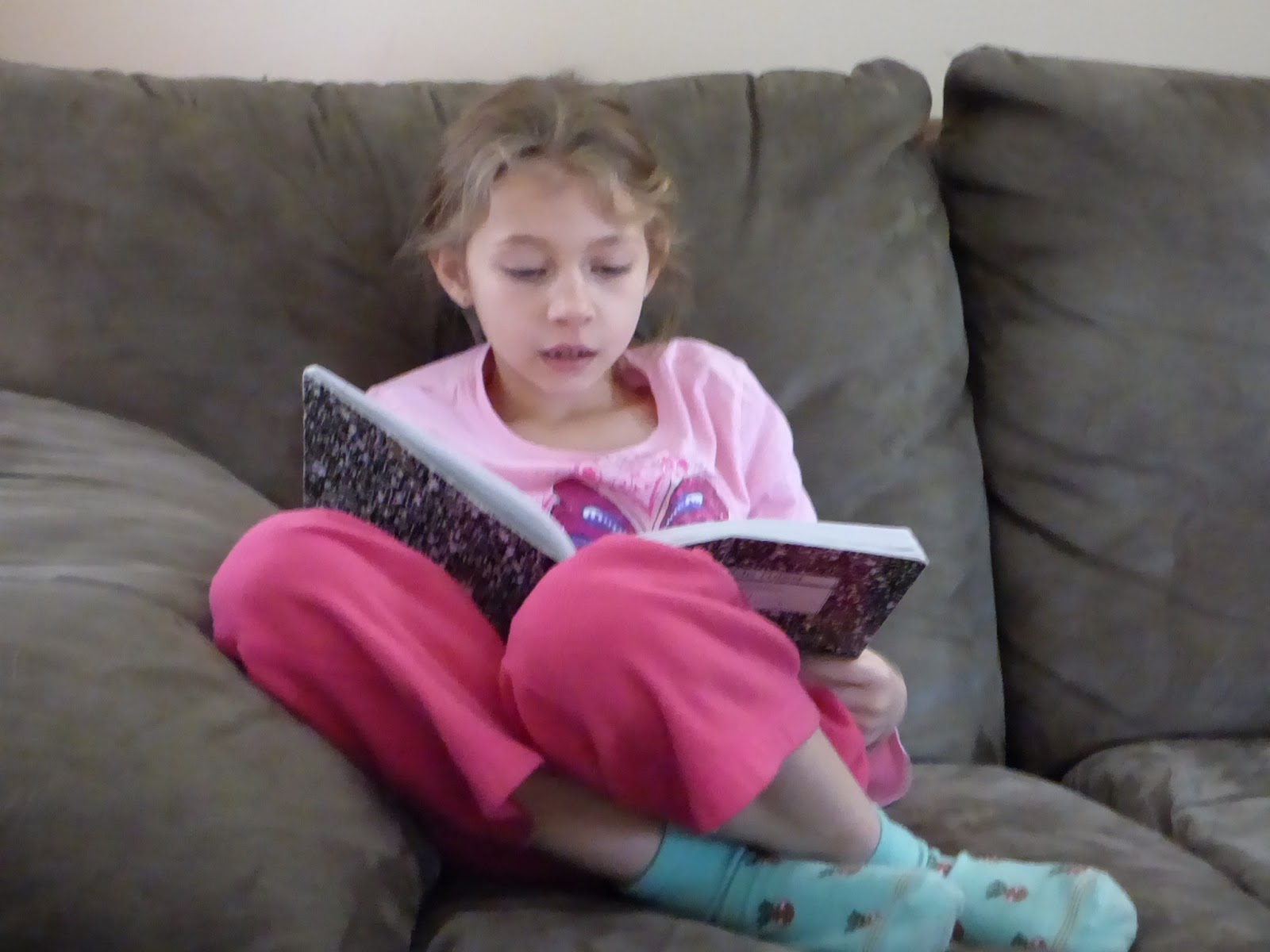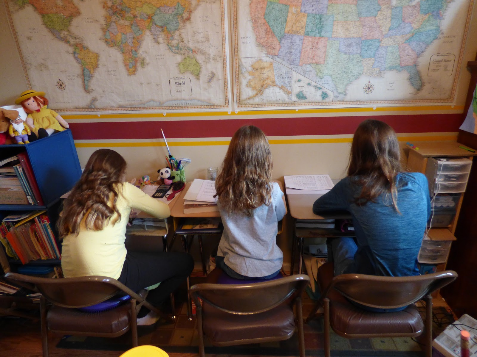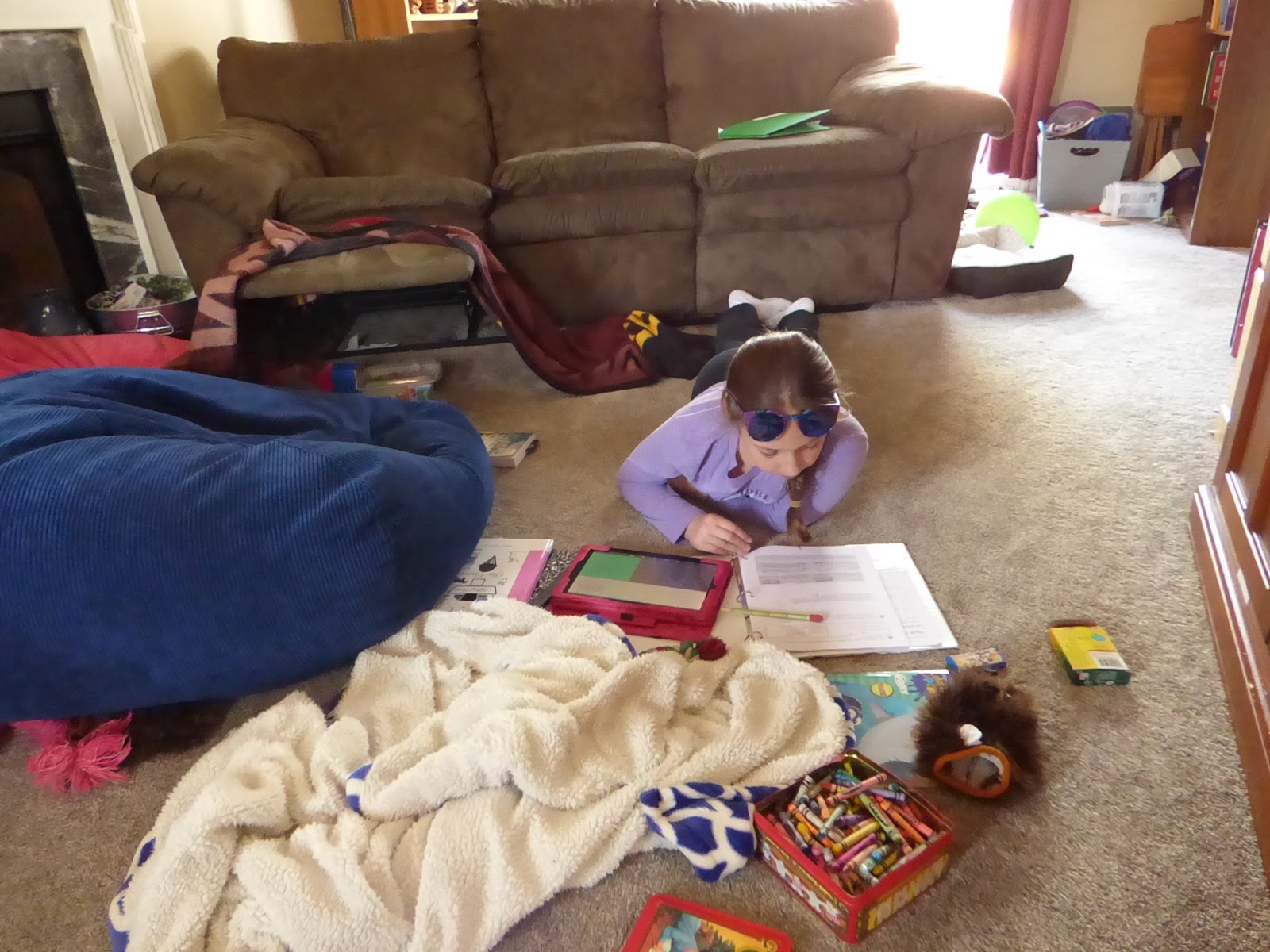 This is what real-life homeschooling looks like! Sunglasses on her head inside, blankets all over from early morning snuggles, crayons from who knows what, doggy toys scattered around, and still learning happens. We have a schoolroom and the girls each have a desk, but honestly, most of their learning occurs elsewhere. One of my daughters likes order and chooses spots without chaos for her learning. This girl seems to thrive with a little clutter in her world. We have a group “clean up” time all around the downstairs after school is done and before I begin teaching piano lessons.