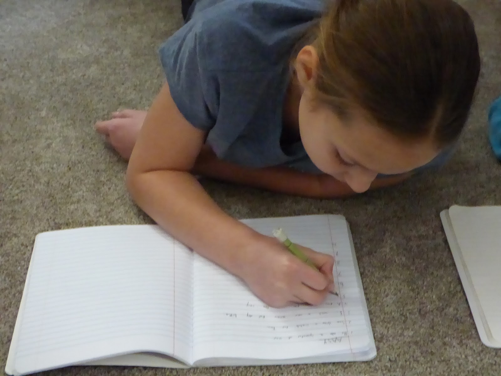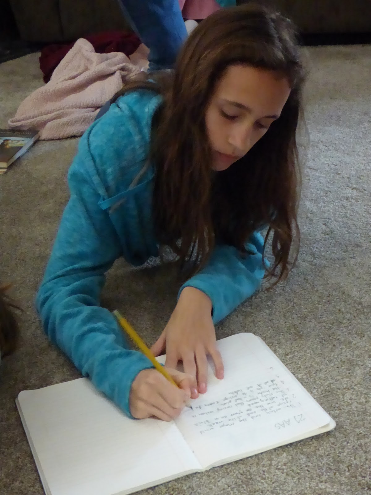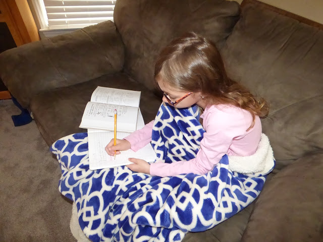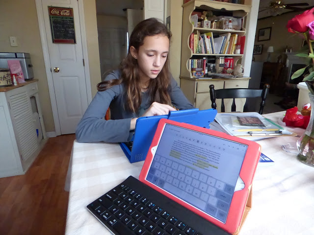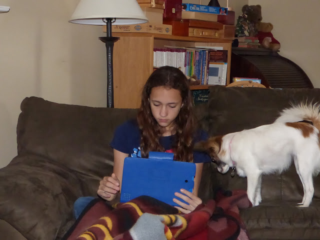 Penny is usually hanging around of of my gals during their studies. She loves to snuggle right with them! Rose uses her tablet more and more for school. Since it is larger it works like a mini computer. On this day she was continuing through her Spanish curriculum. She asked to take this foreign language this year because she feels God is calling her to the mission field one day.
